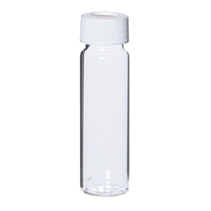 These clear borosilicate glass vials used in Volatile Organic Analysis (VOA) have a capacity of 40 mL. Vials come standard with white open-top caps and 0.125" thick septa.