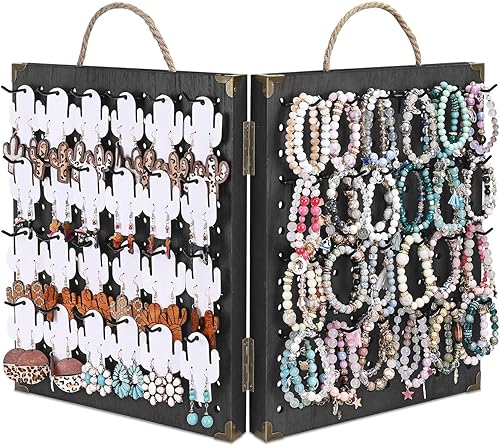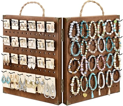 MOOCA Wooden Foldable and Portable 2 Panel Pegboard Jewelry Display Organizer with 48 Removable Black Metal Hooks & Convenient Rope Handle for Easy Carrying, Dual-Sided Panels for Hanging, Brown Color